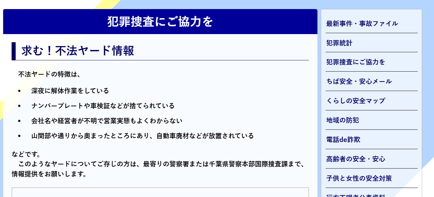 千葉県警などでは、自動車ヤード総合対策として、盗難自動車の保管、使用済自動車の無許可解体や不法滞在外国人の稼働等の違法行為を認知した場合には、各種法令を適用した取締りを実施しており、市民からの不法ヤード情報提供を求めています。千葉県警:犯罪捜査にご協力を 求む!不法ヤード情報