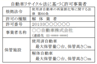 →自動車リサイクル業の許可事業者には標識の掲示が義務付けられていますので、そうした標識の有無も確認のポイントです。