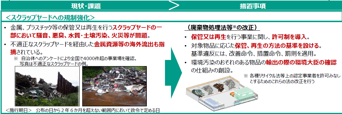 近年、不適正な管理が行われているスクラップヤードが環境問題(騒音、悪臭、土壌汚染、火災など)を引き起こし、また有価な金属資源の海外流出の温床となっていることが指摘されています。これに対し、改正案では、屋外で金属やプラスチックなどの使用済み物品を保管する事業者に対して許可制度を導入し、規制を強化する方針です。法の目的(第1条)には、要適正再生使用済金属・プラスチック物品等が追加されます。スクラップヤードへの規制強化で無許可営業、無確認輸出等の違反には、廃棄物と同等の罰則が適用されます。