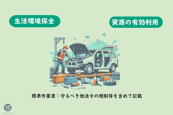 自動車リサイクル法の目的は、廃棄物の適正な処理と資源の有効活用です。廃棄物を適正に処理することにより周辺住民の生活環境を保全します。あわせて業を的確に、継続して行うことができることを、標準作業書その他書面に記載する必要があります。