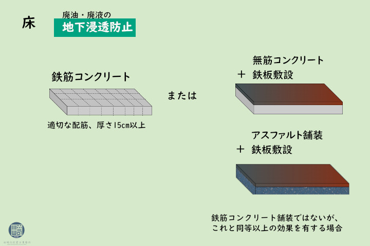 いずれも、廃油・廃液の地面への漏出・浸透を防ぐことが目的です。
