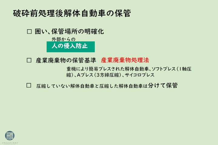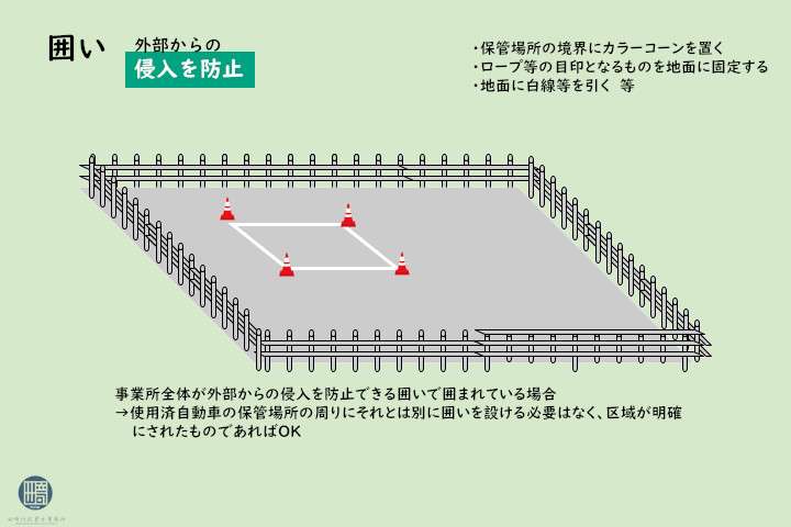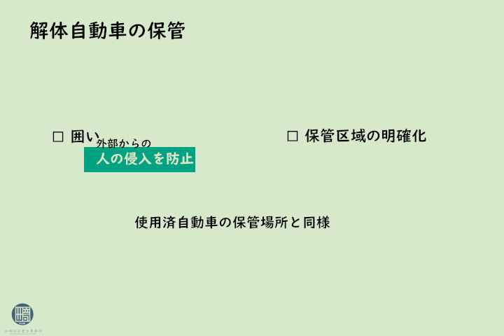 解体自動車の保管場所については、解体作業場以外に解体自動車の保管場所を設ける場合、外部からの人の侵入を防止することができる囲いが周囲に設けられ、かつ保管区域が明確にされた場所とすることが必要です。
