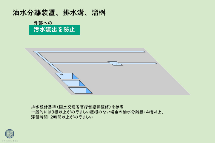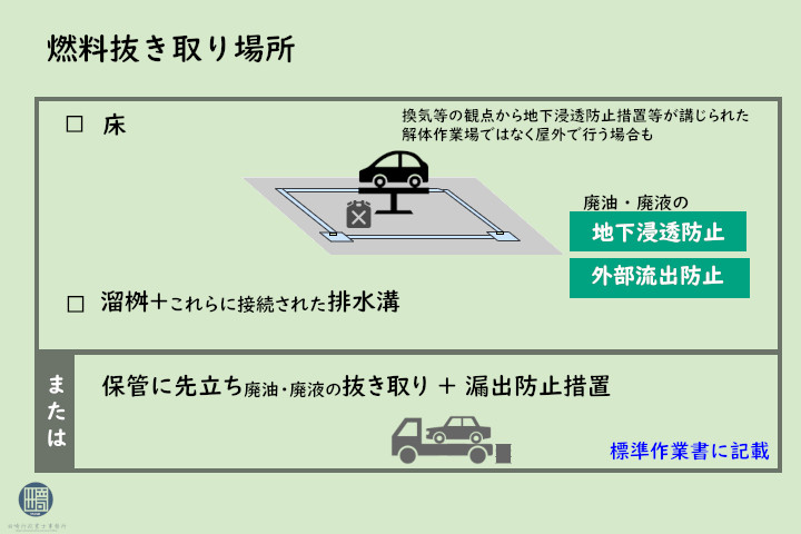 燃料抜取場所には、に排水溝及びそれに接続したため桝が必要です。上記油水分離槽等を備えた解体作業場で抜き取りを行うことも可能です。この場合解体作業場の排水を処理するために設けた油水分離装置と共用となります。 燃料抜取場所に屋根等が設置されていない場合はそこに降る雨水の量も勘案して油水分離装置の能力を定める必要があります。
