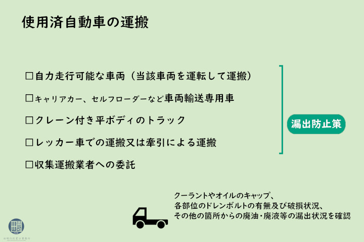 - 廃油・廃液の漏出及びそのおそれがない場合はレッカー車での運搬又は牽引