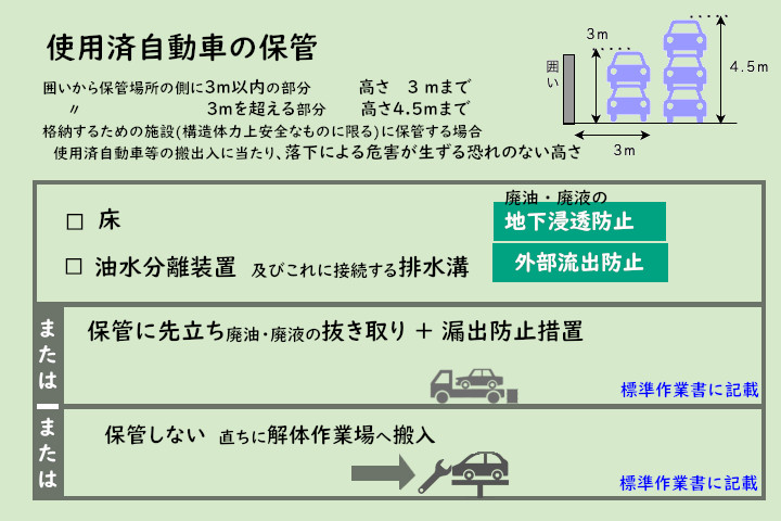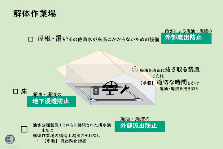 解体作業場の要件としては、廃液を適正に抜き取ることができる装置を有するか、または適切な時間をかけ手作業により使用済自動車から廃油(燃料は除く)、廃液の抜き取りが確実に行われることが標準作業書により明らかにされている必要があります。 廃油、廃液の地下浸透措置として、床と油水分離槽等の条件があります。