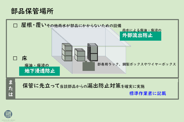 保管に先立って当該部品からの漏出防止対策が確実に行われることが標準作業書により明らかにされている場合や、 保管に先立ち部品の外部に付着した油分を十分に拭き取るとともに、開口部を閉じる等の措置を講じることにより廃油が外部に流出することがないことが標準作業書により明らかにされている部品については、必ずしも上記保管場所に保管する必要はありません。