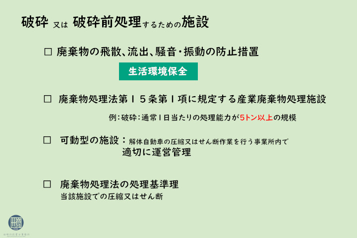 破砕施設、破砕処理前施設は廃棄物が飛散し、流出し、並びに騒音及び振 動によって生活環境の保全上支障が生じないように必要な措置を講じる必要があります。 当該施設が廃棄物処理法第15条第1項に規定する産業廃棄物処理施設である場合を受けている施設は既に環境保全上適正な処理を行うことが担保された施設とみなされます。