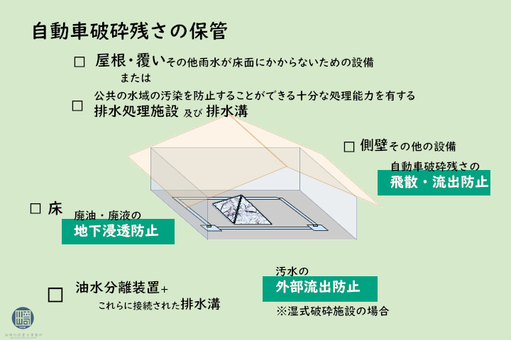 自動車破砕残渣の保管については汚水の地下浸透止措置と部流出防止措置が必要です。同様の目的で屋根、覆いその他雨水が自動車破砕残さにかからないようにするための屋根や覆いなどの設備を有する必要もあります。公共の水域の汚染を防止することができる十分な処理能力を有する排水処理施設及び排水溝が設けられている等により降雨時でも外部への汚水の流出がない場合はこの限りではありません。自動車破砕残さが飛散又は流出することを防止するための側壁やその他の設備(コンテナ等)も必要な措置の1つです。