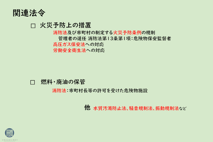 関連法令として、火災予防上の措置に関する消防法及び市町村の制定する火災予防条例の規制などがあります。 危険物保安監督者の選任や、高圧ガス保安法への対応も必要です。労働安全衛生法への対応として労働安全衛生法第14条(施行令第6条第2項) アセチレン溶接装置を用いた溶断作業には作業主任者を選任することなどにも注意が必要です。 燃料等については、消防法により、市町村長等の許可を受けた危険物施設以外の場所で貯蔵・取扱いを行ってはならないとされており、危険物施設における貯蔵・取扱いの技術上の基準が定められています。また市町村の条例で指定数量の 1/5以上から指定数量未満の危険物に関する技術基準や届出義務等が課せられている場合もあります。