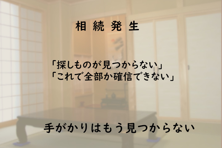 相続発生時には、訃報連絡や各種手続きのため被相続人(故人)の身の回りの捜索がはじまります。被相続人が周到にエンディングノートや遺言で準備してあればそれを参照すればいいのですが、その用意がない場合は遺族は、故人の身の回りの書類や金庫、通帳などから手がかりを探すことになります。 相続人の中には普段生活をともにしていない場合は、普段の生活状態を共有しておらず書類を探す場所の手がかりのない状態ではなおさら困難なものになります。 ただでさえ、精神的なショックもある中、時間的にもタイトな対応を迫られる中で、「探しものが見つからない」あるいは「これで全部か確信できない」状態は、相続人にかなりのストレスとなってふりかかることになります。