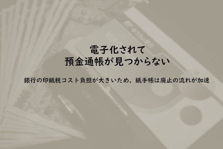預金通帳の電子化。 紙の預金通帳を発行管理するのにはコストが発生してます。紙の通帳を発行すると、1口座当たり毎年200円の印紙税がかかり、銀行がそれを負担しています。個人や法人の顧客が3500万を抱える三菱UFJ銀行の場合、毎年およそ80億円の税金を負担しているといわれています。業界全体では毎年約700億円に上るとの試算もあります。 欧米の銀行では口座管理の手数料をとるのが一般的なようですが、日本では銀行が負担しているため、これを電子化し印紙代を削減するメリットは大きく、たとえば、みずほ銀行では、2400万口座のうち約半数が1年以上記帳されていない 全ての口座について、毎年1月末時点で1年以上記帳がない口座は、自動的に「みずほe-口座」に移行(定期預金は満期から1年)するなど積極的にペーパーレス化・電子化をすすめています。 これまでの「紙の通帳」は使えなくなり、デジタル通帳に切り替えになります。相続の際に、通帳を手がかりに口座を捜索する従来の方法は難しくなっていきます。