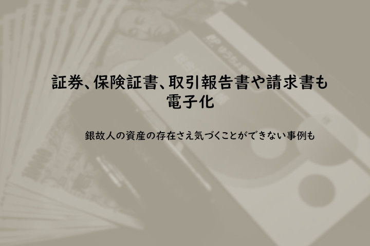 自動車保険や生命保険など、保険業界でもペーパーレス・電子化の流れで、保険加入後に受領する保険証券を発行しないことで、保険料を割引く制度:「保険証券不発行特約」が増えています。 株式など証券業界でも、取引報告書を 書面ではなく電子交付する例が多くなっています。 また、証券やFXの取引は、パソコンやタブレット、スマートフォン内で完結することが多いため、故人(被相続人)がデジタルな情報にアクセスする手段を残さないまま、相続を迎えてしまった場合は、その資産の存在さえ気づくことができない事例も増えています。公共料金の請求書やお知らせなどもWebによるお知らせ方法に変更しつつあり、相続時には公共料金のお客さま番号や、水道の水栓番号などが手続きで必要となりますが、そういった基本的な情報も家の中に紙の情報としては残っていないかもしれません。