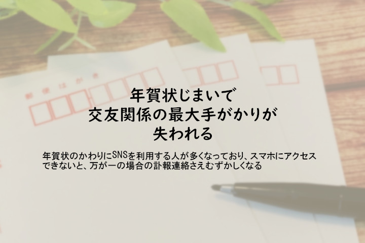 年賀状を出さない年賀状じまい。 年賀状は、かつて故人の交友関係を確認する有効な手段でした。 しかし、近年では葉書による年賀状のやりとりをやめる方も増えているようです。2022年 確定発行枚数:19億860万500枚で、2021年の21億3443万2500枚 前年比はマイナス約10.6%です。ピーク時の2003年の44億5936万枚に比較すると年賀状のやりとりから、連絡先や交友関係を調査し、訃報連絡等を行うことは難しくなりつつあるのかもしれません。