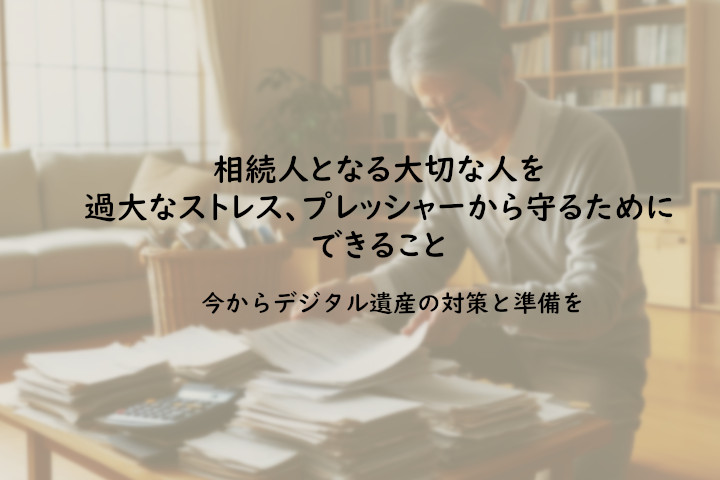 デジタル遺産への対策 こうした書類がない状況で、対策もないまま相続を迎えてしまうと、相続人は過大なストレスとプレッシャーを抱えることになります。 書類が見つからない、これで全部だろうか、急がないと間に合わない、という焦りは、相続人から故人を悼む時間を奪い、労力を奪い、余裕を奪います。こうした悲劇から相続人を守るため、今からデジタル遺産に対応した準備を行う必要があります。 また、相続後は、こうしたデジタル遺産に対する対策の不備は大きなリスクとなって相続人にふりかかるのです。