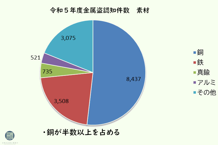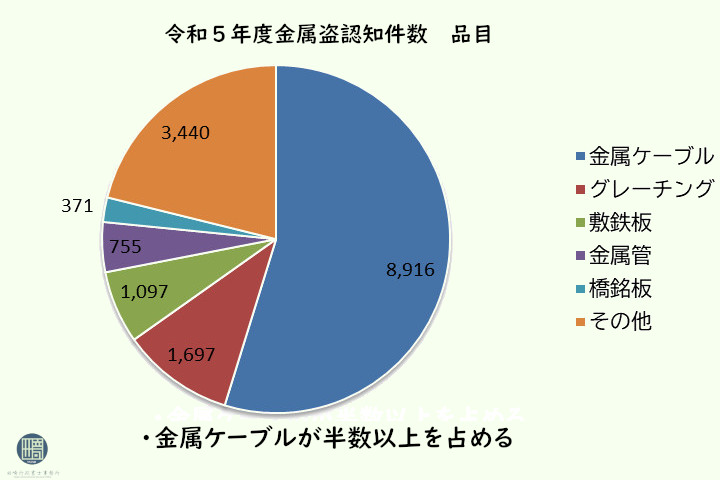 令和5年度の金属盗難の品目別認知件数は、その半数以上が金属ケーブルになります。近年も太陽光発電のケーブルが大量に盗まれ発電を再開できない事態に追い込まれる事件が発生したりしています。