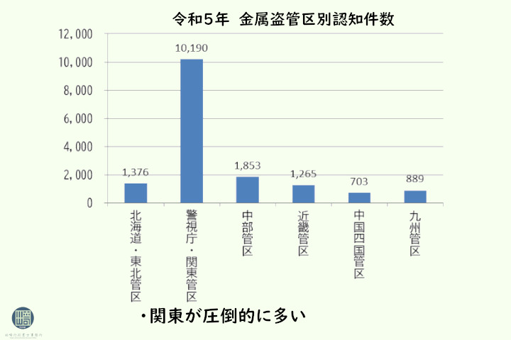 金属の盗難が発生している地域は、関東地域が大部分をしめます。この状況に対応して、この後に述べる金属くず条例の制定地域も関東を中心として分布しています。