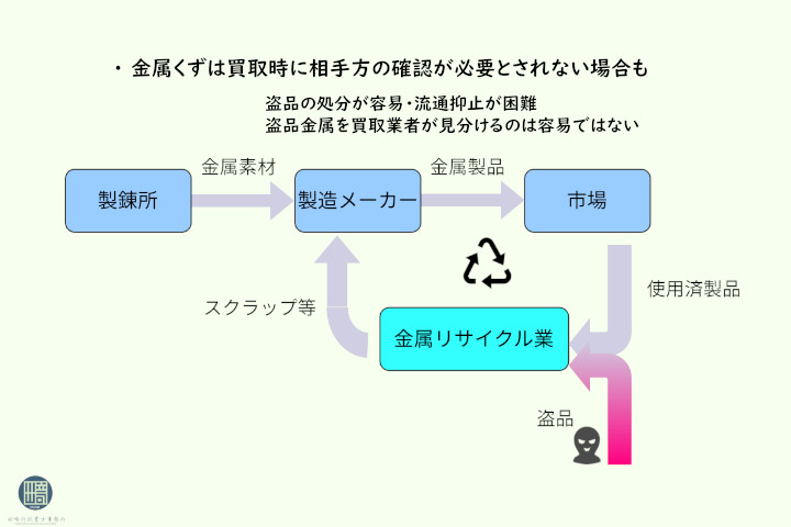 金属の買取りには古物営業法の適用がないので、業者が自主的に身元確認をしない限り、買取相手の身元確認は行われません。そうした事情を見越して、金属の窃盗犯は身元を確認しない業者を把握した上で買取に持ち込みます。 また、持ち込まれた金属くずが盗品であるかどうかの判断は、業者側には難しいため、現状では盗品の処分や流通を抑止することはたいへん難しくなっています。