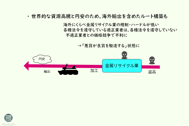 各地で相次いでいる太陽光発電施設の事件については、不法滞在の外国人グループが組織的な犯行をおこなっており、そして、複数の県で犯行を重ねて、その資金源にしていると警察ではみています。日本人が外国人グループと共に犯行に及んでいたり、あるいは日本人が単独で給湯器ですとか、室外機の窃盗を繰り返していたという事例もあります。 海外では、金属リサイクル業は許可制で、日本の方がハードルが低いため、日本で金属リサイクルを行い、円安の状況の中、日本国内で調達した金属を不適正に輸出して為替利益とあわせて利益を得るということも行われているようです。 各種法令を遵守している適正業者は、法令を遵守していないコンプライアンスの低い不適正業者と競争しても価格競争で負けるため、「悪貨が良貨を駆逐する」状態になりかねない状態になっています。