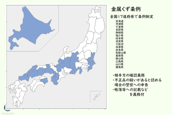 金属くず等の盗難は、世界的に高まる金属需要の高まりを背景とするものですが、もう1つ要因があります。金属くずをとりまく法規制です。一度、使用された中古品などを買い取る業者は、古物営業法という法律に基づいて営業許可を受けています。古物営業法では都道府県公安委員会を受け、取引相手の本人確認や、帳簿保存、不正の品であると認められる場合の警察への申告義務などがありますが、金属くずは、古物営業法の範囲外となるため、これらの規制を受けないのです。 古物は、中古であっても客観的に本来の用法にしたがって使用できるか、を基準に古物に該当するか判断するためです。 廃棄物であれば、廃棄物処理法やその他リサイクル法の適用も受けますが、価値のあるものとして業者に買い取ってもらうため、これにも該当しません。