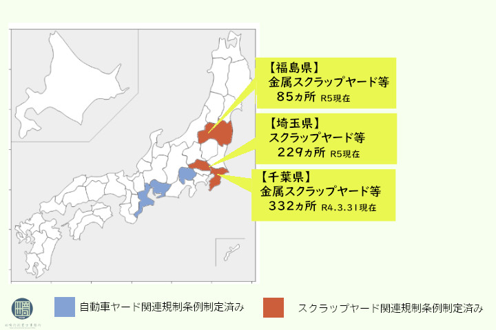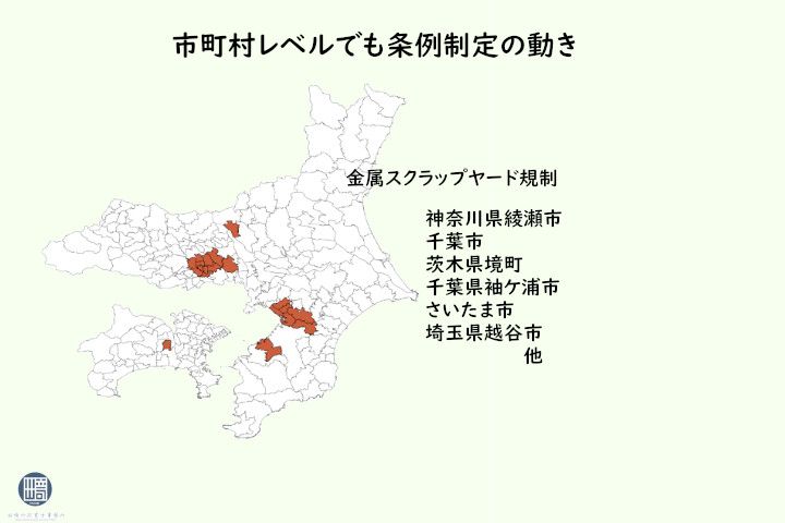 最近増えている金属スクラップヤードを対象とした条例は、金属スクラップヤード業者に対する近隣住民の生活環境への影響、苦情の増加を踏まえ不適正な業者を規制すべく制定されたものです。関東圏を中心として広がる金属スクラップヤード業者と近隣住民のトラブル増加により、都道府県レベルだけでなく市町村レベルでも条例化の動きが活発になってきています。