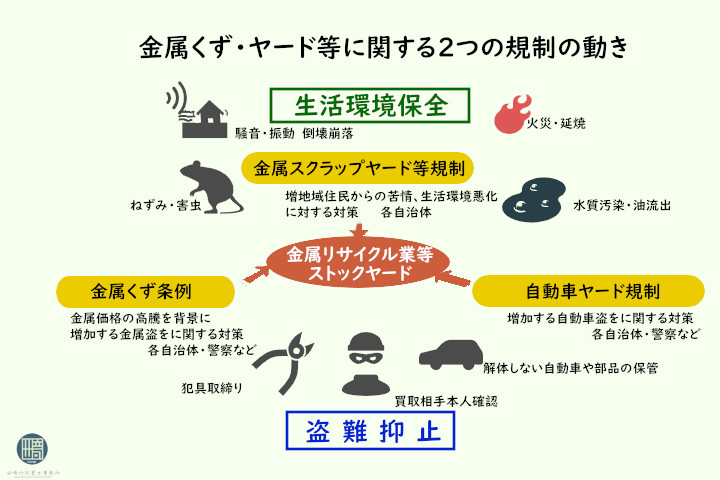 金属スクラップ等を取り扱うリサイクル業やストックヤード業に対する規制の高まりは、大きく2つの目的があります。 1つ目はすでに述べたとおり、生活環境の保全のための規制です。 もう1つは、世界的な金属価格の高騰を背景とした金属窃盗の増加や自動車窃盗の増加です。金属くずは中古品に当たらないため古物営業法の適用を受けないことから、有価で金属くずを買い取る業者側に本人確認の義務 はなく、盗品の流通を防げない、という現状があります。 金属スクラップヤード業者(金属リサイクル業やストックヤード業など)は、周辺住民の生活環境保全と、盗難抑止という2つの理由で規制の声が高まっているのです。
