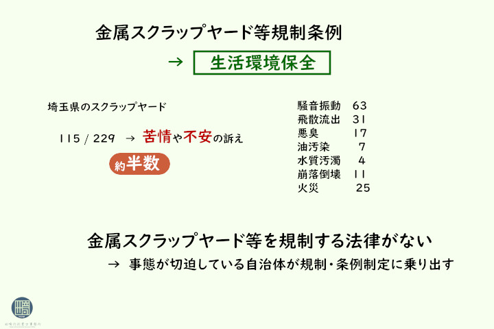 千葉、埼玉、福島の各県で条例化された金属スクラップヤード規制は、近隣住民の生活環境の保全を目的としています。埼玉県の調べでは、金属スクラップヤード業のうち半数以上が、近隣住民からの苦情・不安の訴えを受けています。その内容は騒音振動や飛散流出、悪臭、火災や水質汚染などです。問題のある業者でも産業廃棄物処理法などの法規制を受けないため、自治体レベルで対処療法的に条例の制定が相次いでいるという状況です。