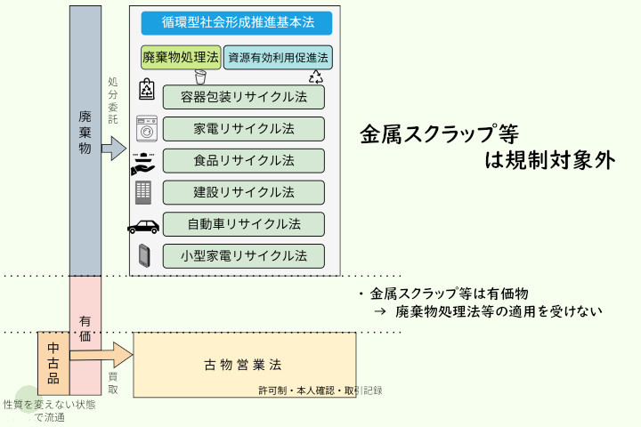 なぜ、金属スクラップは法規制を受けないのでしょうか?金属スクラップは、再利用の価値があるので価値があるものとして業者が買い取る形で取引されます。金属スクラップ等は廃棄物ではないので、廃棄物処理法の適用を受けません。同じ理由で買い取りをした自動車の解体を行わず、部品のみを保管するような業態も、原則として自動車リサイクル法、廃棄物処理法の適用を受けません。 廃棄物処理法、自動車リサイクル等も保管基準の遵守や、周辺生活環境への配慮をきびしく問われますので、こうした法規制を免れうることは参入のハードルを大きく下げ、一部の業者の不適正処理を助長する結果となっています。
