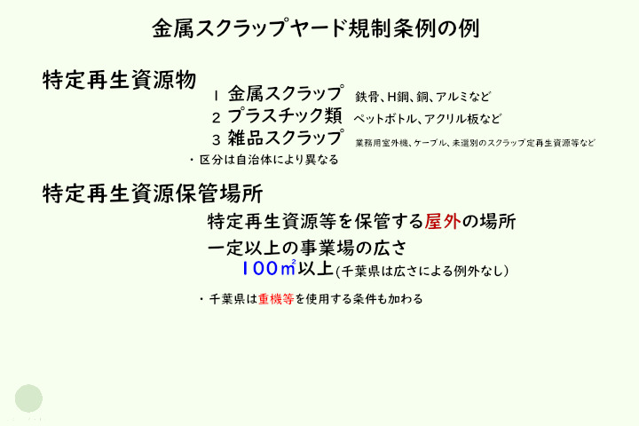 金属スクラップなどを屋外で保管する業者を規制する、金属スクラップヤード規制条例に関して概要をまとめました。