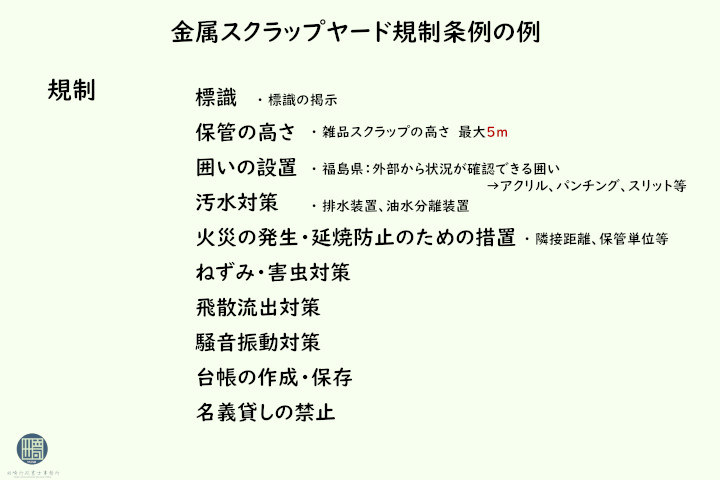 規制内容は、自治体にもよりますが、標識の掲示、保管の高さや保管方法、事業場の囲いの設置、汚水対策、火災の発生・延焼の防止の措置、ねずみ害虫対策、飛散流出対策、騒音振動対策などを行うこと、帳簿を作成保存すること、名義貸しなどをしないことなどがあります。保管方法などは産業廃棄物処理法の保管基準などをベースとして、雑品スクラップの倒壊崩落を踏まえた保管基準などがあります。福島県などでは保管状況を確認するため、囲いの素材を中身を確認できるようアクリル板やスリット構造などにするよう求めています。