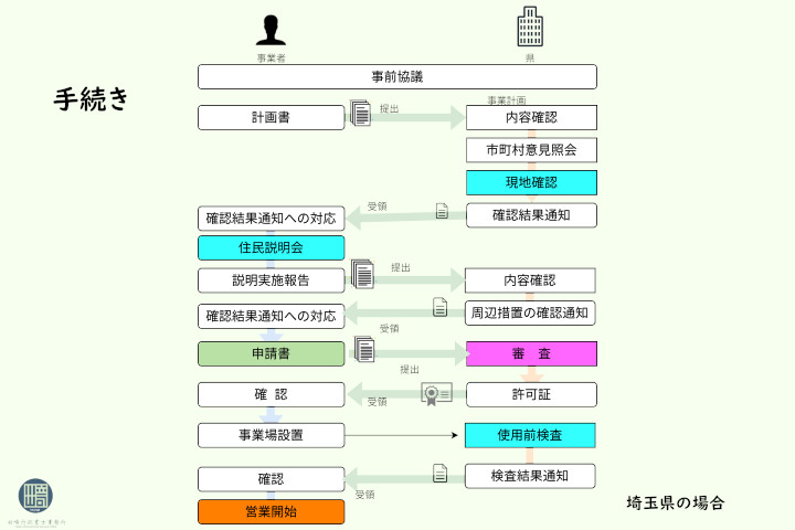 申請手続きは、産業廃棄物処理法の処分業許可や、自動車リサイクル法の解体業・破砕業許可と同じような行程を辿ります。周辺住民の生活環境の保全が目的として大きくありますので、住民説明会で周辺住民への事業内容の説明が必須です。申請書には、各種対策をどのように実行するかを手順にした「標準作業書」を作成し、添付する必要があります。