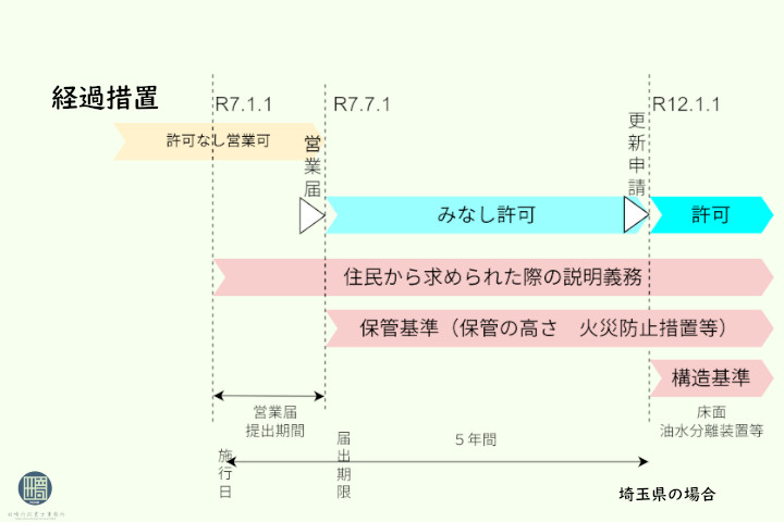 施行時点ですでに業として金属スクラップヤードを営む業者に配慮して、各県とも経過措置が導入されています。 図は埼玉県の例です。既存業者の負担を軽減するため段階的に保管基準や構造基準への対応を求める形となっており、基準を満たしていない部分があっても「みなし許可」として許可業者として取り扱います。他の県でも、対応までに1年の経過措置を設定している場合などがあります。