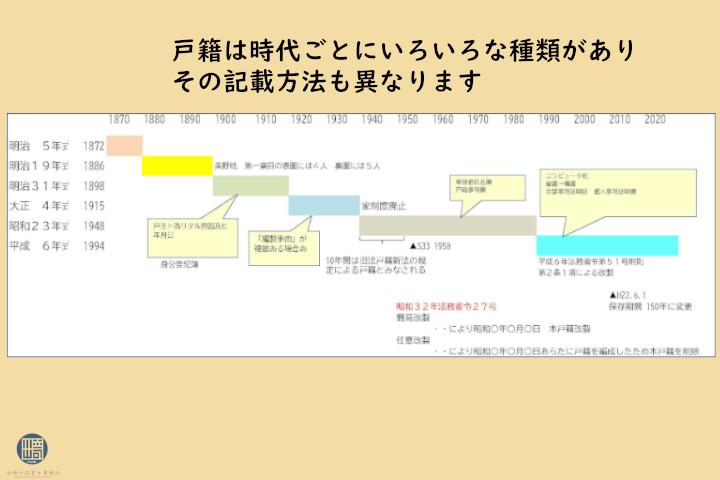 以上、戸籍の種類についてご説明しました。 戸籍は出生から死亡までを一度で証明できる世界的にみても稀な制度ですが、過去にさかのぼって確認する場合や、本人と家族のつながりを追っていく場合には過去の戸籍制度の内容に照らし合わせて詳細に確認していく必要があります。この作業の過程で、確認ミスやもれがあると、相続の場合、協議事項が無効になったり、税額の計算に影響してくる場合がありますのでご注意ください。戸籍の収集や読み解きが難しい場合は行政書士などの専門家にご相談ください。