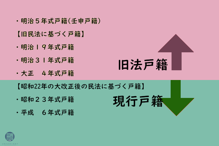戸籍は、大きく現在の現行戸籍と旧法戸籍とに別れます。現行戸籍と旧法戸籍では、戸籍に記載するルールが大きくことなるため注意が必要です。