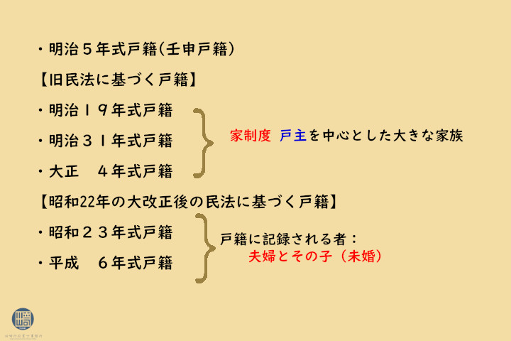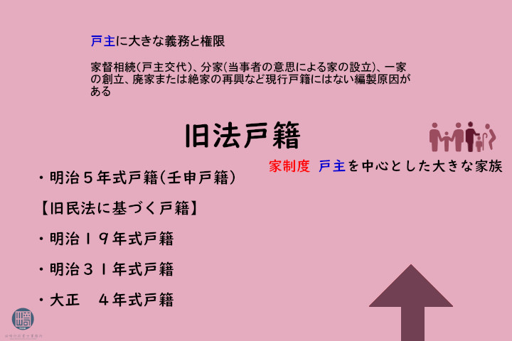 旧法戸籍は明治31年の旧民法により戸主をして家族の統制と維持の責任を追わせる「家」制度のもと作製されています。ですので、現行の戸籍にはない家督相続(戸主の交代)、分家(当事者の意思による家の設立)、一家の創立、廃家または絶家の再興など、現行戸籍にはない原因でも、これをきっかけとして新しい戸籍が作られています。 旧法戸籍には、家制度のもと複数家族が記載されており、また記載ルールも現行戸籍とは大きく異なるため注意が必要です。