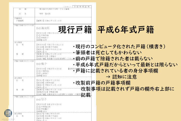 さて、旧法戸籍3種類と現行戸籍2種類とはどのような戸籍でしょうか? 現行のものからさかのぼって確認していきましょう。 まずは平成6年式戸籍です。 コンピュータで管理され、様式も横書きとなっています。また記載内容は箇条書きになっています。 様式としては最新ですが、他市町村への管外転籍などにより除籍(戸籍が削除)されており、最新の戸籍は別にある場合もあるので内容をよく確認する必要があります。 また、戸籍を新しく編成(作製)する場合、その時点に戸籍に在籍する者のみを新しく編製された戸籍に移記するため、過去の婚姻・養子縁組・死亡等により除籍(戸籍から削除)された人は移記されないことに注意が必要です。 また、相続上は、非嫡出子(認知された子)も関係してきますので、戸籍に含まれない認知された子の情報を読み漏らさないことも重要です。