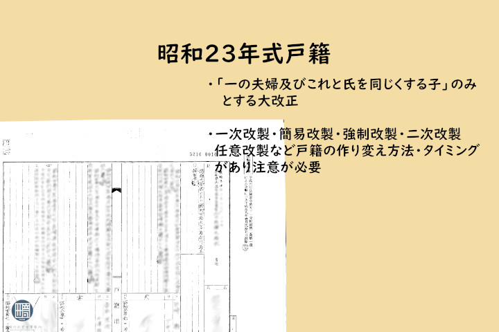 昭和23年式戸籍は、縦書き様式で手書きされています。先に述べたとおり昭和23年式戸籍は家制度から1つの家族と未婚の子へ構成単位を変更する大改革であったため、その変更過程に気をつける必要があります。戸籍の様式変更は一度に作り変えるのが難しかったため、経過措置を設け数度のタイミングで段階的に行われました。一次改製・簡易改製・強制改製、二次改製・任意改製などです。その過程でいくつものパターンがあるため、戸籍を確認する際には注意が必要です。 また、昭和23年以前の戸籍は手書き、文章形式であり、時代を遡るほど漢数字、旧字や変体仮名も出てくるため現在のコンピュータ化して戸籍に比べて読みにくさを感じる方もいらしゃると思います。