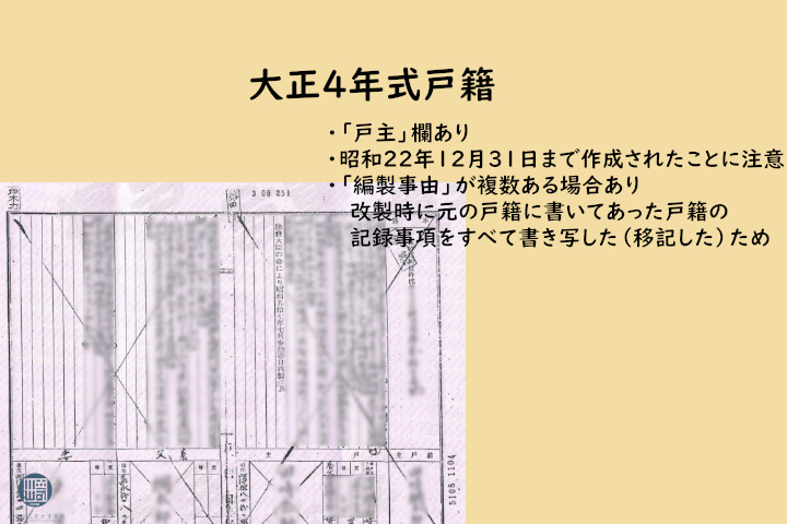 大正4式戸籍は、大正3年戸籍法改正に伴い編製されました。戸主欄があるのが特徴です。身分登録簿が廃止されたため身分事項に関する記載内容が詳細になりました。明治31年式戸籍では戸主以外すべてに「家族トノ続柄」欄がありましたが、必要な場合のみ設ける形になっています。戸籍編製以前の戸主の出生や、婚姻といった身分事項も移記されているため日付の前後関係を把握する際には注意が必要です。